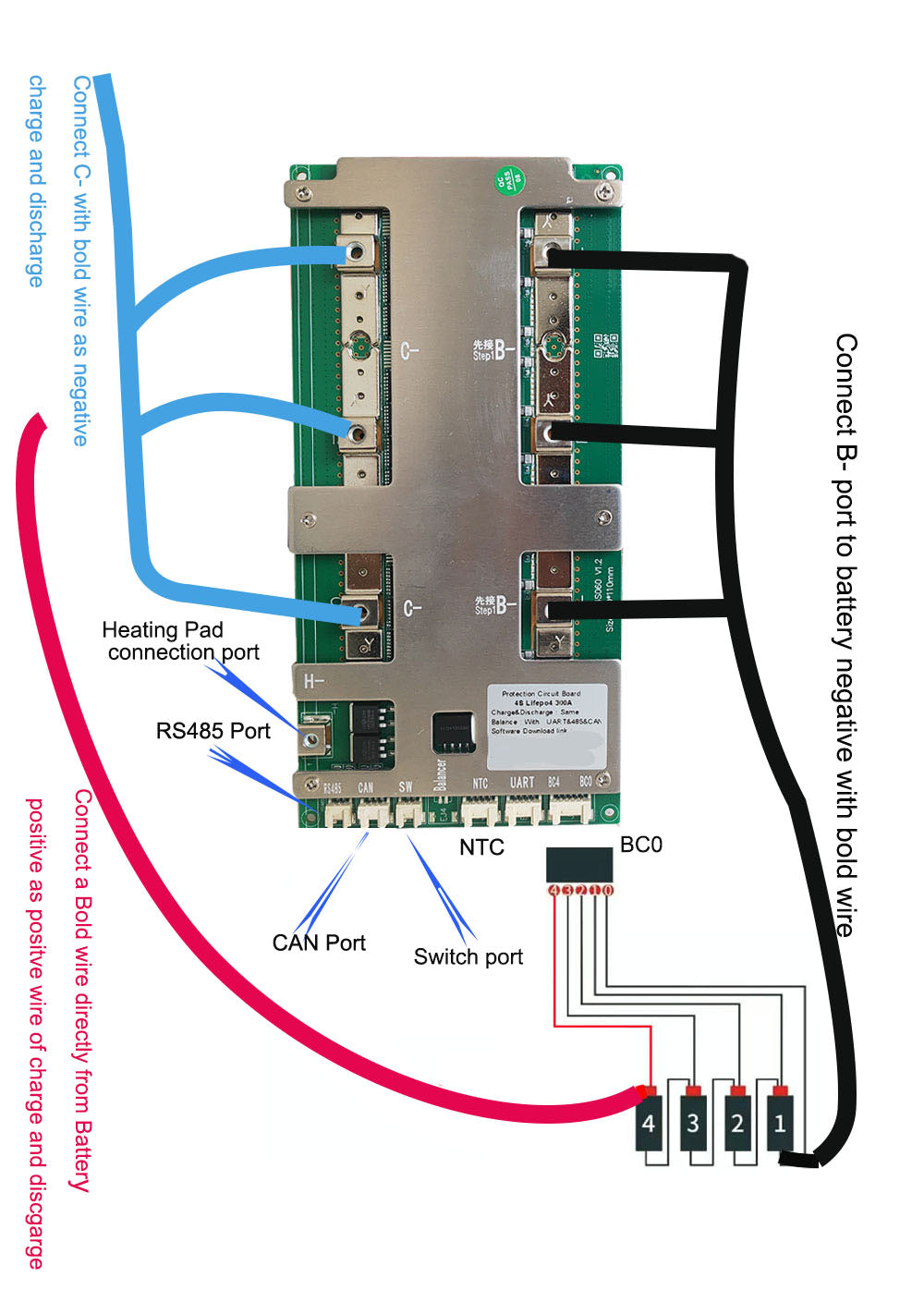 This is a smart BMS with Bluetooth and PC communication which will be used to protect and monitor your battery status visible from the computer and your android APP phone .which can support UART , RS485, or communication ,client can select different communication based on your application demand .the charge and discharge port is same,also BMS modules can be Max supports 4S Battery in series connection for 48V system application,client can select such specification based on your demand .
